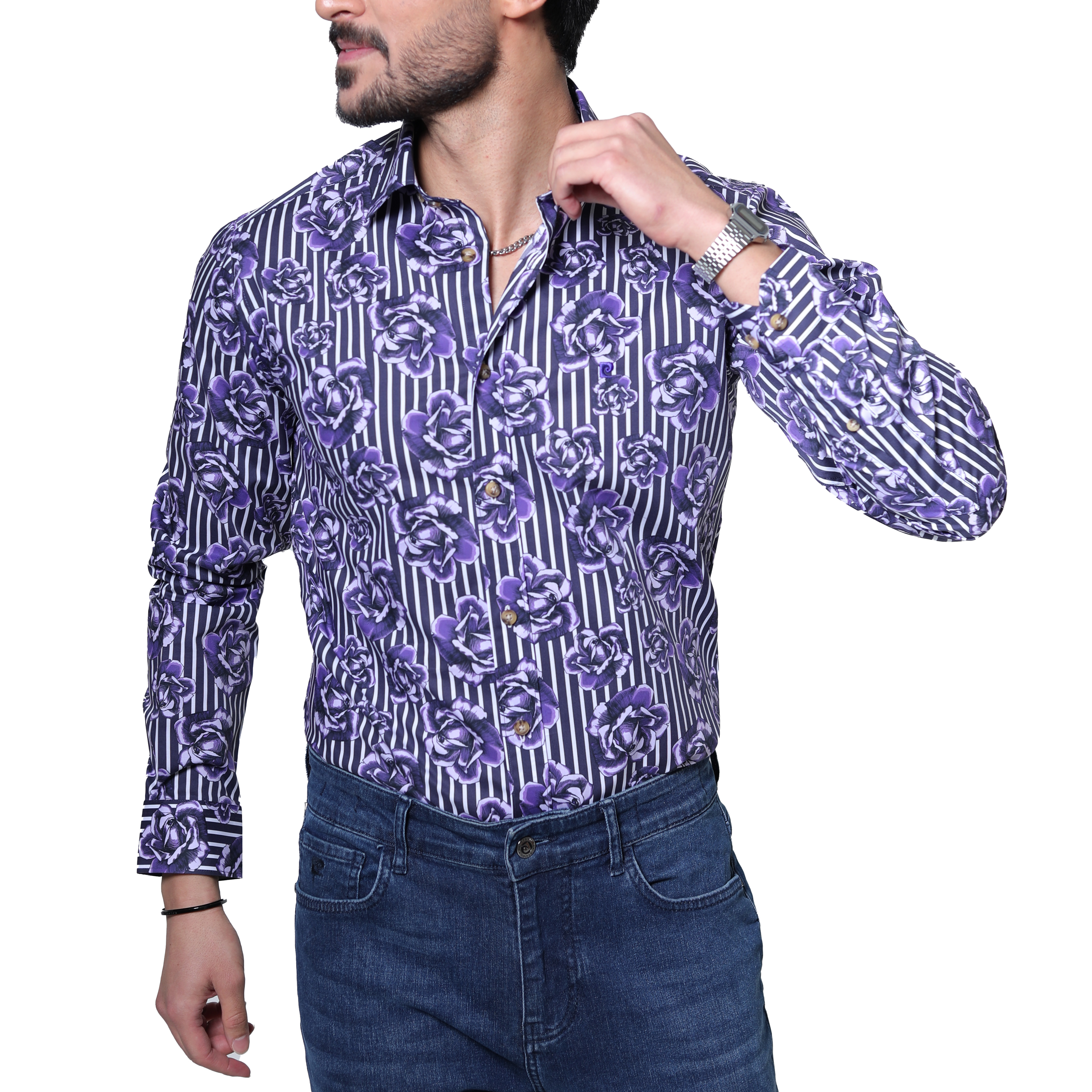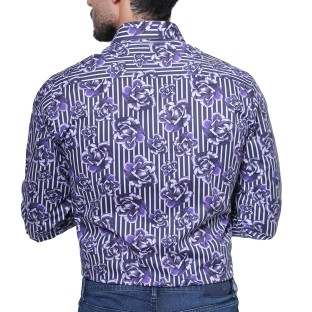 پیراهن مردانه آستین بلند طرح گل و راهراه بنفش