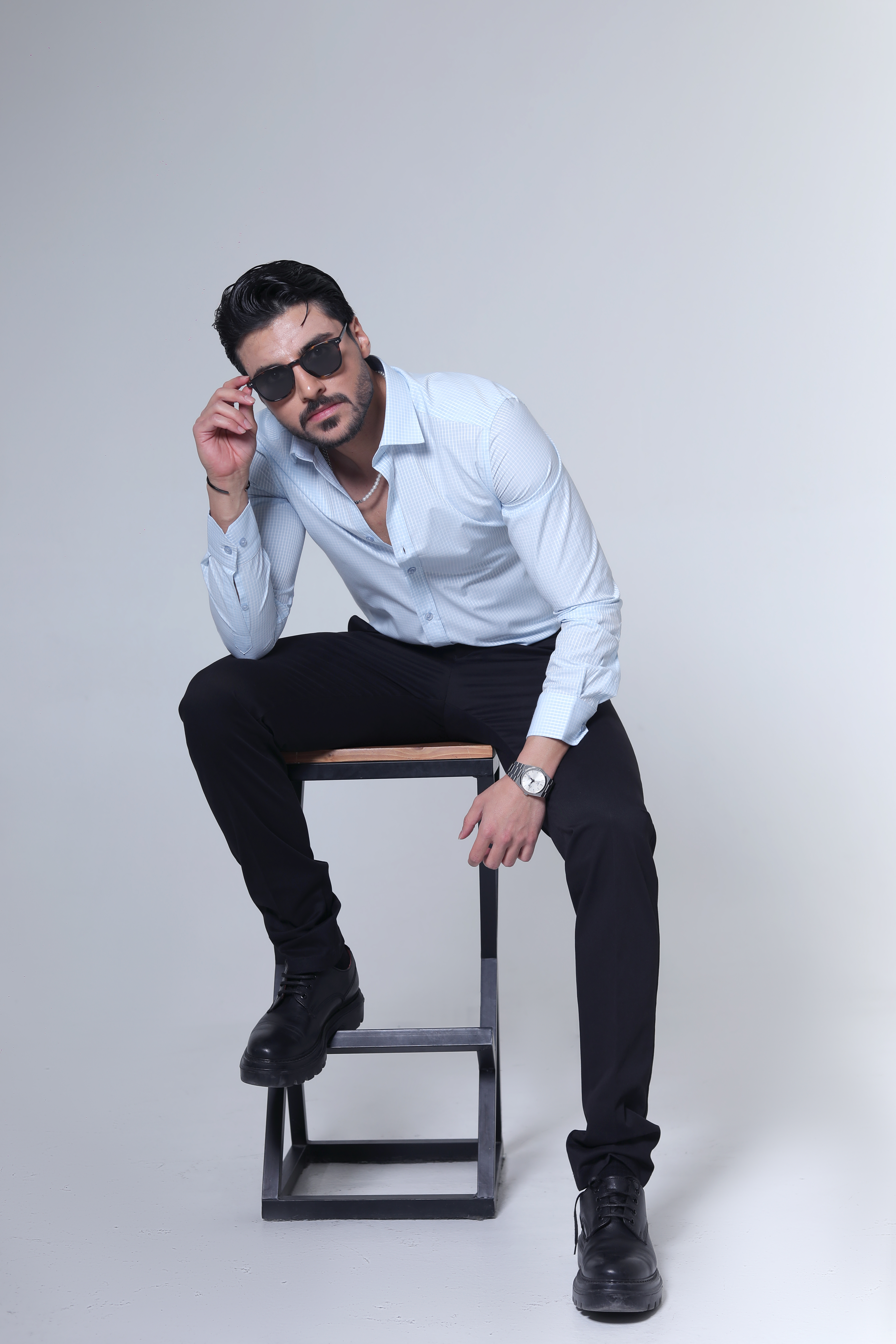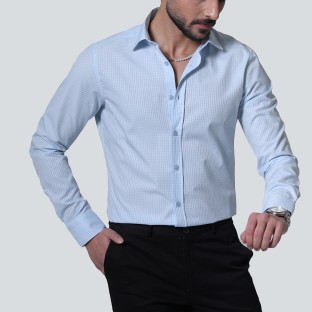 پیراهن مردانه آستین بلند چهارخانه ریز آبی روشن